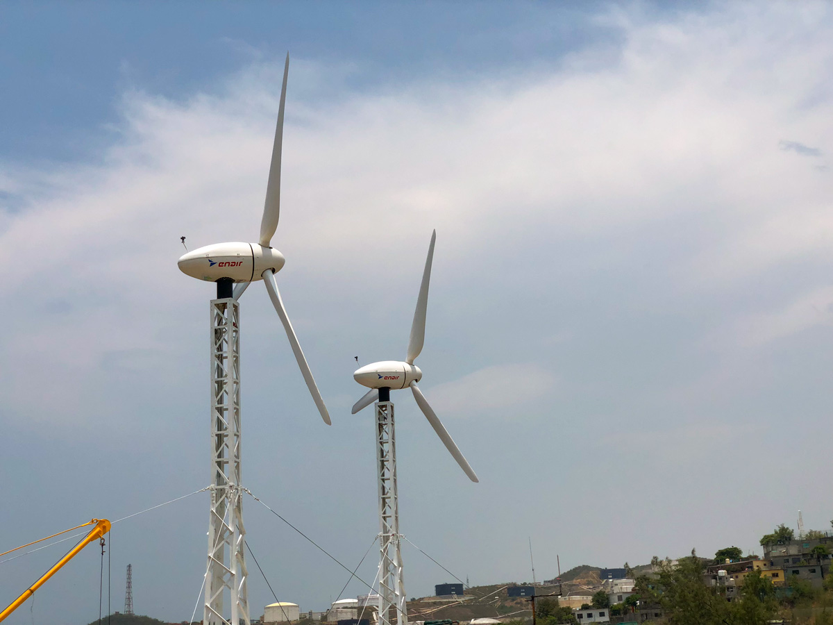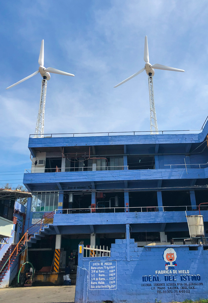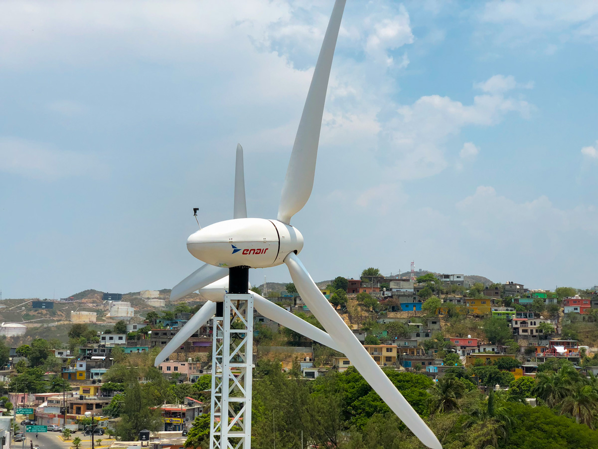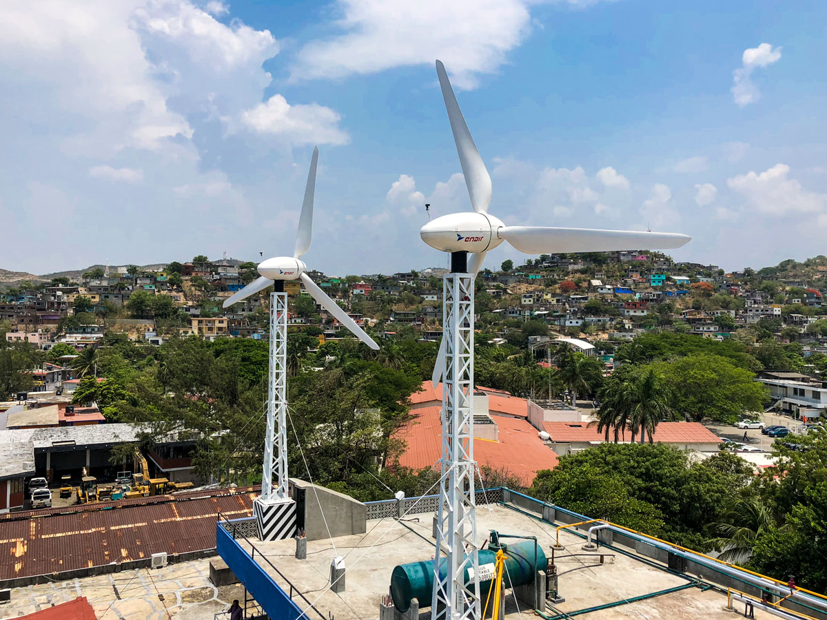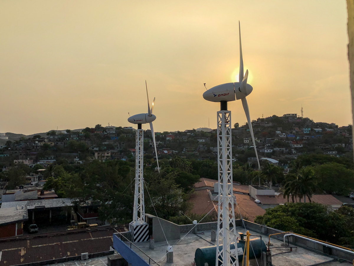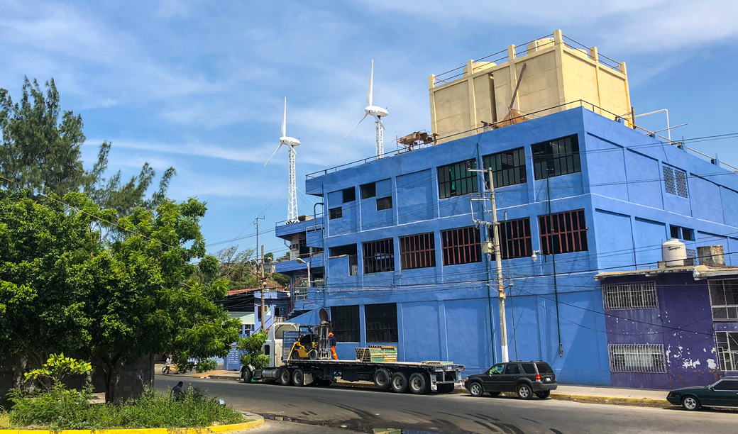 In the area of Oaxaca with an average wind of about 7.5m/s is the ideal place to demonstrate the efficiency of our E200 series, these two wind turbines installed on the roof of the ice factory at a height of 25m (including its towers of 8m) are capable of generating an average of 190.6kWh/day