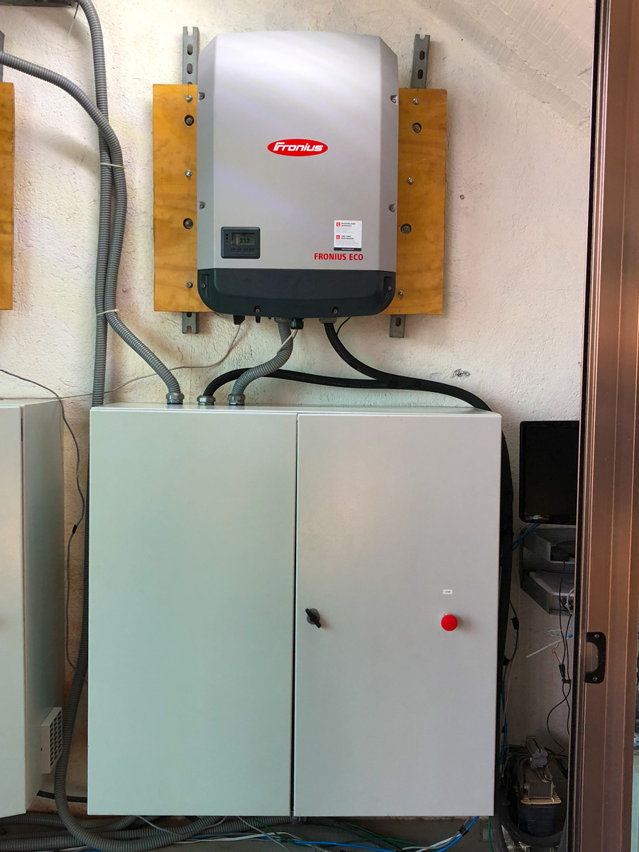 This installation will cover an energy demand around 20% of the total of the factory, the grid connection installation is composed of 2 wind turbines E200 of 20kW together with 2 inverters Fronius Eco27 of 27kW.