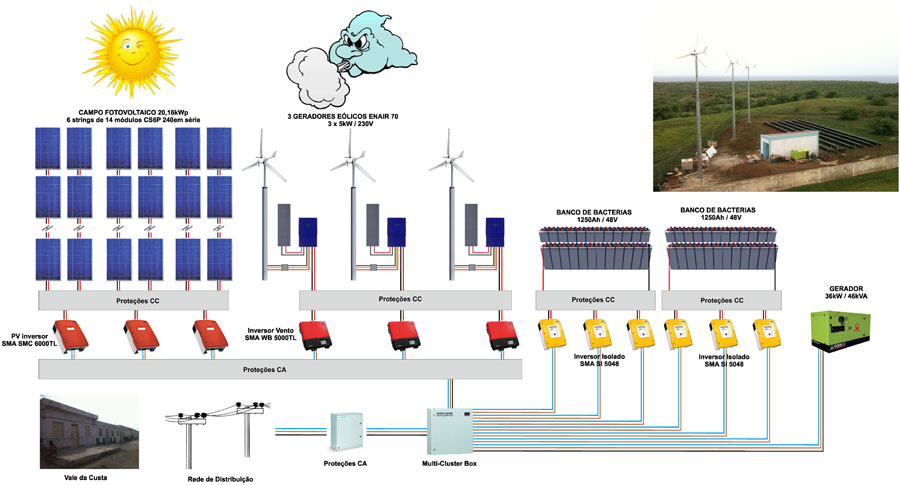 This new project was based on the development of a electricity-generating micro station by means of renewable energies combining polycrystalline solar technology, the mini wind turbine Enair 70 and the most advanced SMA inverters on the market.